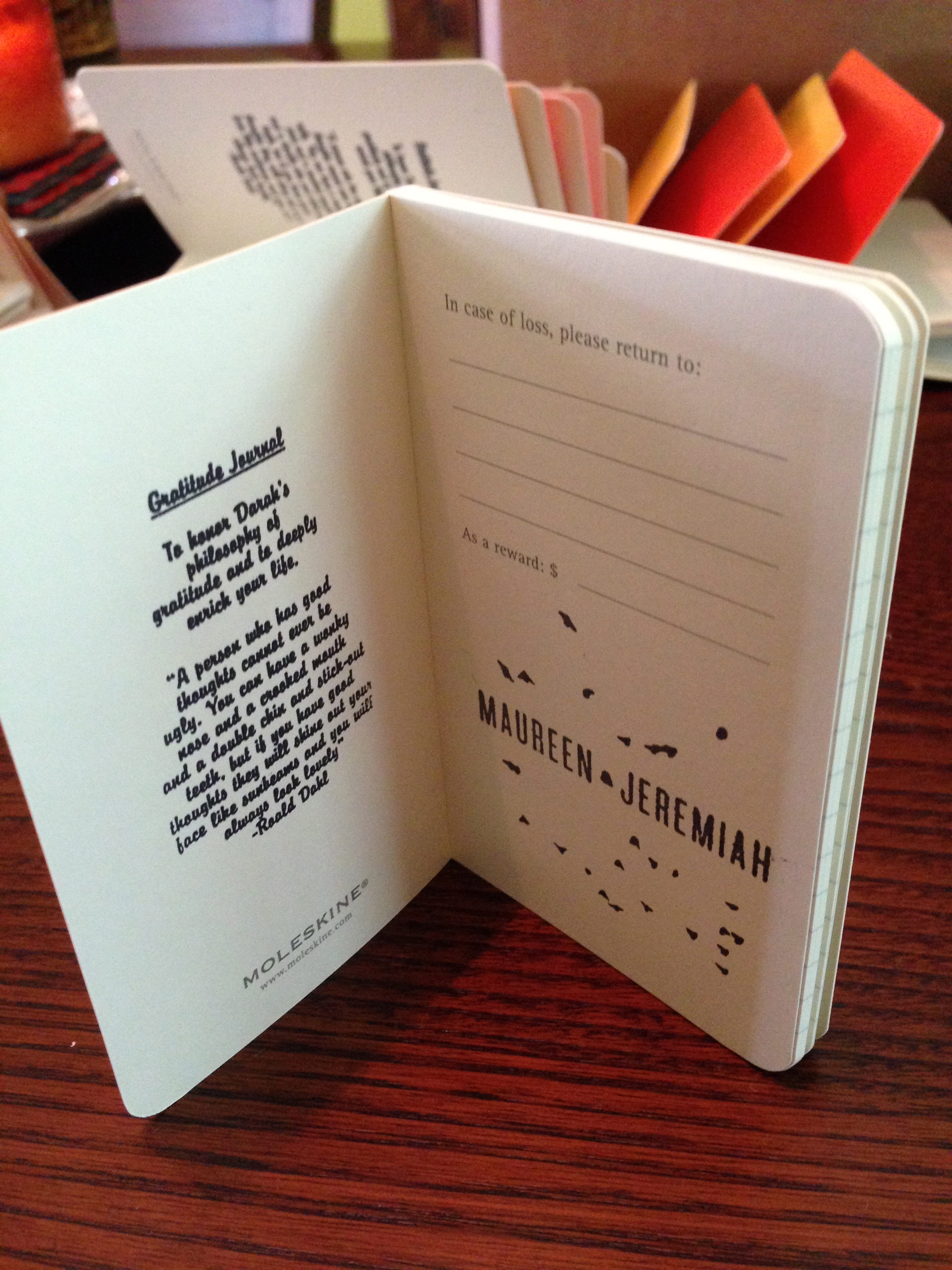 As we have mentioned on this blog before, Darah’s last Christmas gift to all of us were “positivity jars” which were mason jars with slips of paper, a marker, and instructions to jot down notes about the positive things in your life. I was dead set on not spending money on favors, until we came up with the idea to spin off Darah’s positivity jars with gratitude journals for our guests. We bought Molskine journals and hand stamped each of them. Thanks to Darah and the joyful way that she lived her life, we were able to spread the message of gratitude to all of our wedding guests.