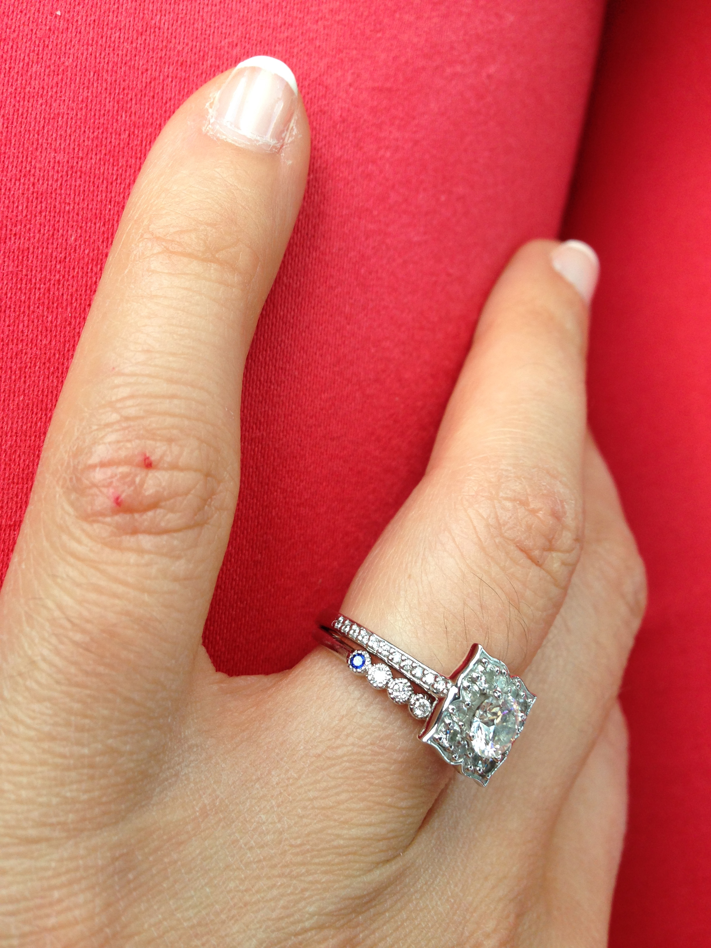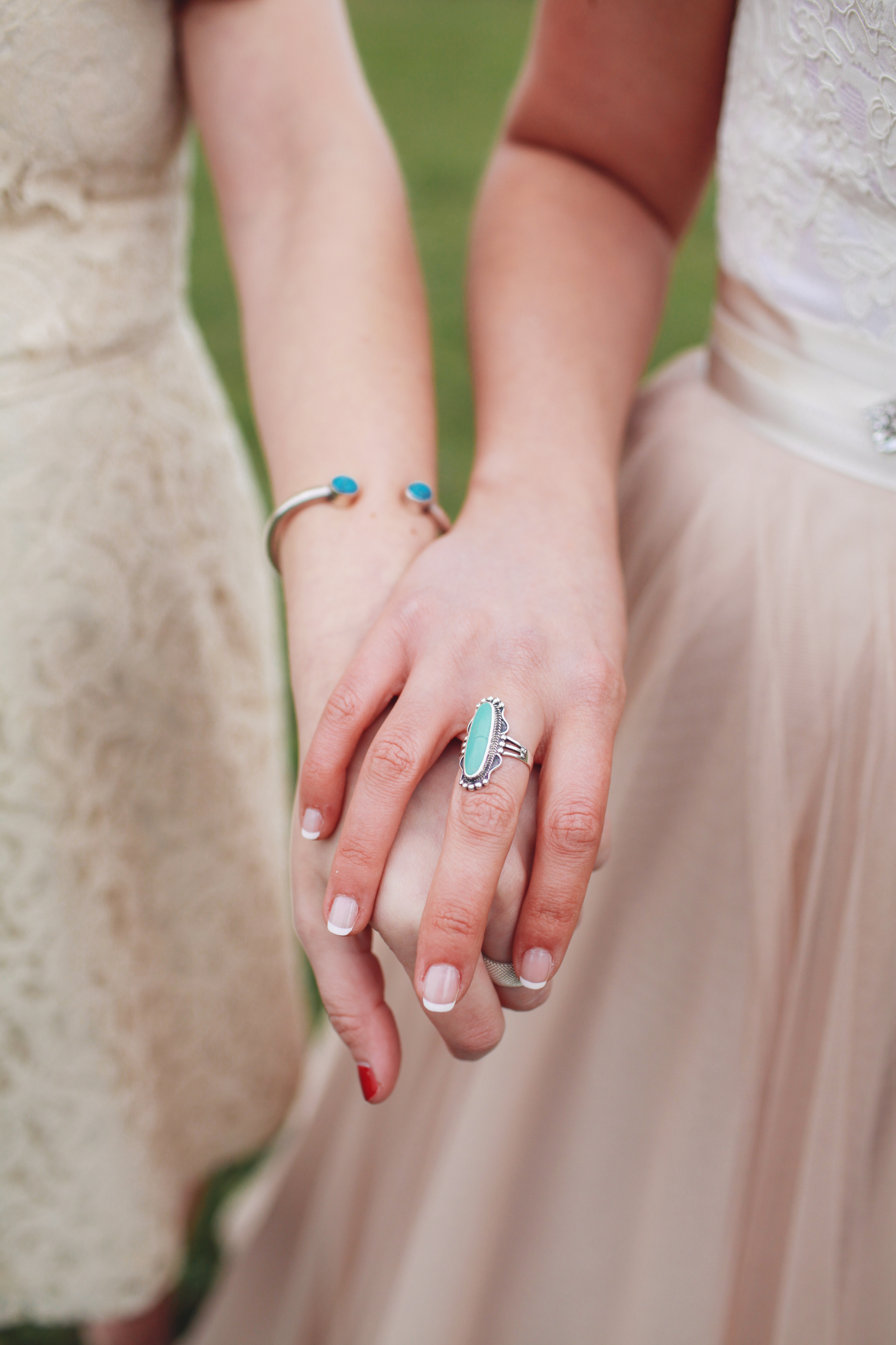 The day that Jeremiah proposed to me on the chair lift at Holiday Valley Ski Resort, he told me that he wanted to ask me to marry him on the top of a mountain so that we could be as close to Darah as possible. He went on to explain that he and his jeweler searched far and wide to find me a diamond with two very specific flaws: one called a feather and one called a cloud. Because of my strong connection to birds in flight, these slight imperfections in the diamond forever engraved my sisters spirit in the ring that symbolizes our love. To make my ring set even more special, my wedding band has 11 small diamonds and 1 sapphire, which was Darah’s birthstone. Additionally, Kristen and I wore pieces from Darah’s turquoise collection.